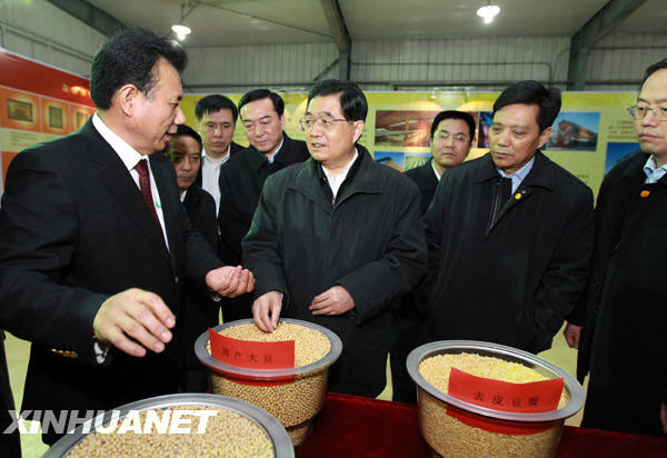 胡錦濤在三河匯福糧油集團有限公司了解生產經營情況。新華社發