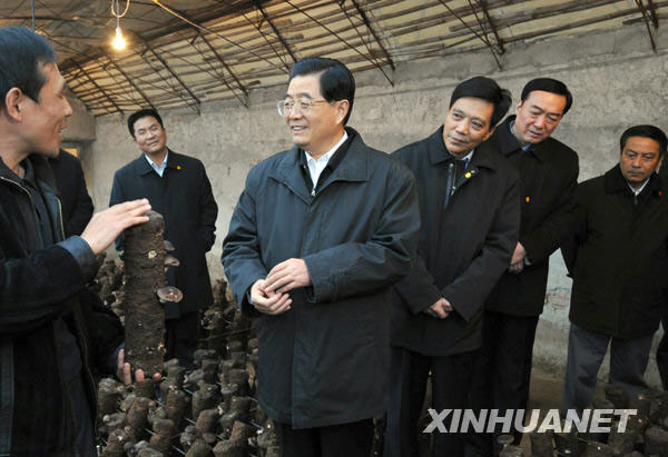 胡錦濤在三河市李旗莊鎮李旗莊村香菇大棚里,了解香菇種植專業合作社帶動農民增收情況。記者李學仁攝
