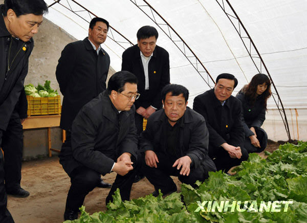 胡錦濤在三河市李旗莊鎮李旗莊村生菜大棚了解冬季農業生產情況。新華社記者李學仁攝