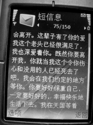 ????3月7日上午開始,大量的短信談到了雙方的“約定”——一起去“天國”。3月7日上午10點41分的一則短信說:“親愛的,我好痛心,好失望……事情沒有我想象的那樣,沒有誰的婚可以離得那么順利。……我會在我們約定的地方等你。……我在天國等著你。我愛你!永遠的愛你!!”而在于丹丹發(fā)給陳偉忠的短信中,也出現(xiàn)了這樣的語句:“給我打過來,我真的想好好聽聽你的聲音,這樣我也會安心地走,好嗎?”陳偉忠涉及到自殺內(nèi)容的短信還有:10時52分發(fā)的“……永別了我最愛的人!我愛你!”12時17分發(fā)的“……我會靜靜的(地)消失,只帶著太多的遺憾走了,親愛的,我愛你!你要好好的保重!你給我的東西我一定帶著一起走。”13時06分:“親愛的寶貝,我們永別了!不會給你添麻煩了。”13時13分:“謝謝你給我的一切,我永生不忘,謝謝!”最后一條短信發(fā)自15時11分:“我走了,你讓我痛苦一輩子吧。”