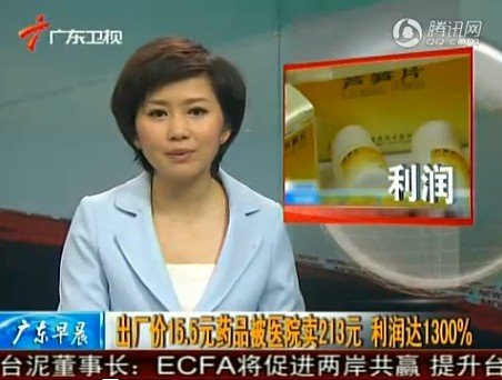????解說:出廠價15.5元,到了患者手上就變成了213元,利潤高達1300%。這兩天這盒小小的蘆筍片讓全社會感到震驚,但是這樣的利潤奇跡不僅僅發生在湖南。根據媒體報道,今年4月15日湖南省物價局制發了全省藥品集中采購投標報價指導價格,其中蘆筍片在湖南政府招投標的指導價是每盒136元,這同樣是一個讓人看不懂的招投標價,因為它超過了企業出廠價的8倍,對此,湖南物價局對此的解釋是,這個價格是參考了周邊省份2008年實際執行的中標價格。言下之意,不僅在湖南,全國很多地方蘆筍片的價格都差不多。