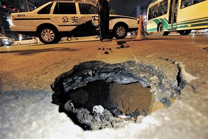 ????“之前馬路還是好好的,這輛出租車駛過(guò),我們就聽(tīng)見(jiàn)一聲悶響,接著就看到出租車前輪陷在路上,車尾部微微翹起,馬路上出現(xiàn)一個(gè)直徑約1米的深坑。”目擊者楊先生稱,深坑突然出現(xiàn)在馬路中間的斑馬線上,出租車司機(jī)下車后也是一臉無(wú)奈,后來(lái)周圍很多人一起幫忙才把車從坑里抬出來(lái)。記者趕到現(xiàn)場(chǎng)時(shí)看到,南京路東側(cè)的江西路路段車輛已經(jīng)排起了長(zhǎng)龍,交警正在現(xiàn)場(chǎng)調(diào)流,在塌陷的深坑前100米處橫著一輛警車,警燈閃爍向過(guò)往車輛示警。記者看到塌陷的坑口有古力蓋大小,深達(dá)兩米左右,下面沒(méi)有地基土,只留下20厘米厚的柏油路面。附近的搶修人員告訴記者,坑邊的路面下也可能沒(méi)有地基,要求大家站得遠(yuǎn)一些。