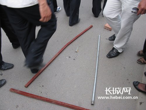 ????下午18時30分,記者趕到邢臺市商業銀行橋東支行,醫護人員正在搶救一名城管隊員,附近多名城管隊員臉上、身上有傷。記者看到,商業銀行橋東支行院內外有多處血跡,城管隊員手中仍拿著磚頭、三角鐵和帶有血跡的棍棒。