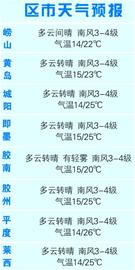 ????據青島市氣象臺首席氣象預報員介紹,由于海洋水溫只有14-15℃,南風一刮,半島氣溫就很難升高,所以最高氣溫較魯中以西來的低一些。目前,在渤海灣的西側有對流云團,這是一個高空低渦造成的。受其影響島城市區的氣溫一直保持在15-20℃,未來三天也沒有什么太大變化。少了海洋氣候的調節,郊區的氣溫開始快速升高,最高氣溫從26℃將一直上升到30℃左右,郊區的氣溫明顯高于市區,且多是大晴天,市民可以放心安排自己的行程。