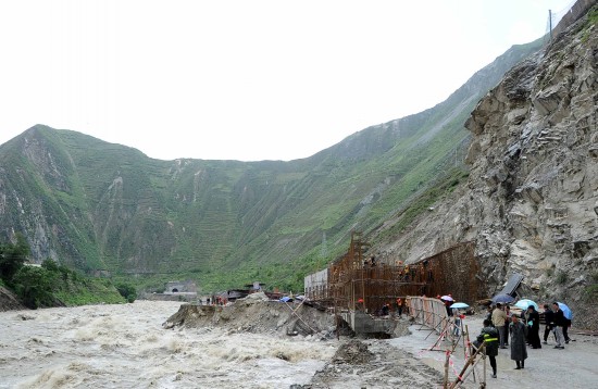 ????6月8日,四川茂縣南新鎮境內寬30米、長100米的保通便道被沖毀后,國道213線完全中斷。新華社記者 陳凱攝 ????連日強降雨致使四川阿壩州茂縣岷江河水位不斷上漲,7號晚上,213國道茂縣段一段路基被洪水沖毀,這一路段徹底中斷,這已經是這條有著“震中生命線”之稱的國道,在近期內的第二次中斷。 ????受上游強降雨影響,7號深夜23多,國道213線茂縣南新鎮段公路被洪水沖毀約100米,道路中斷,一名正在駕駛摩托車的人員失蹤。事故發生后,當地政府立即安排人員搶險救人,轉移周邊學校師生。目前,國道213線茂縣段已實施緊急管制,車輛和人員均被限行。 ????2010年6月8日早晨,國道213線汶川老虎嘴路段也出現三處坍塌路面,其中較大的一塊約70米,深約10米。由于三分之二寬的路面已經不能通行,交通出現了擁堵,交警部門正在全力疏導,路政部門也在加緊搶修道路。 |