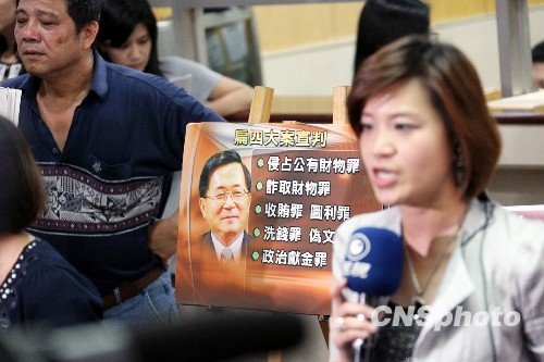 資料圖:2009年9月11日下午,涉及公務機要費、龍潭購地、貪污等案,陳水扁、吳淑珍夫婦被臺北地方法院一審判處無期徒刑,褫奪公權終身。許多臺灣媒體制作小看板,在臺北地院內介紹陳水扁等涉案情況。 中新社發 黃少華 攝