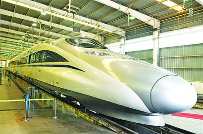 ????由南車青島四方股份公司研制的新一代高速動車組頭車,在世博園中國鐵路館展出。這種帶有CRH380A標志的新一代高速動車組,最高運行時速可達380公里,是中國高速鐵路自主創新的最新成果。