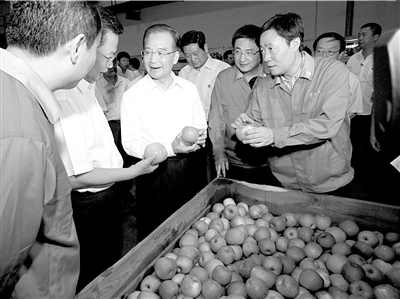 溫家寶向企業負責人詳細詢問蘋果出口情況。新華社記者樊如鈞攝