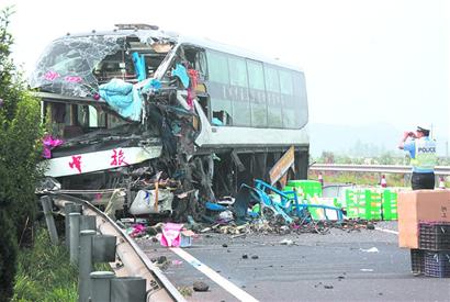 ????“早上的霧太大了,能見度極低。”昨天上午9時許,記者聞訊趕到了同三高速萊西段事故現場看到,一輛大型臥鋪客車橫著停在左側車道上,車頭被撞得面目全非,車頭的左側已經被削去一半,客車內的臥鋪全部露了出來。離臥客30米處,一輛大貨車側翻,車頭被撞變形,車廂上滿載的塑料制品被撞后散落到路面上,將整個高速路右車道堵死。