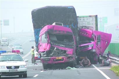 ????記者在現場看到,首先是一輛滿載玻璃的大貨與另一輛大貨相撞,在20多米處,又有4輛貨車撞在一起,車頭都嚴重變形。而再往前行20多米后,又有兩輛貨車相撞在一起。一名大貨司機說,當時由于霧氣太大,盡管速度很慢,但前方貨車剎車,造成后面一串車接連相撞,幸虧沒有造成大的傷亡。