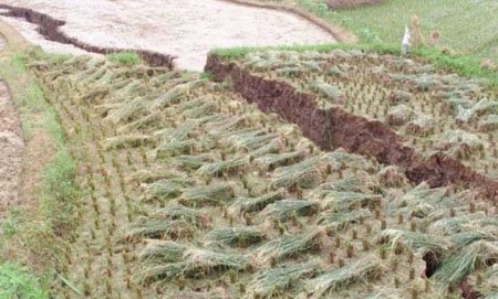 ????7月25日凌晨,湖南省雙峰縣杏子鋪鎮虎塘村發生大面積沉陷,全村近兩平方公里范圍內,不少房屋、公路、水塘、稻田出現沉陷或開裂,房屋裂縫最寬達20余公分,稻田最大裂縫寬度則超過了一米,倒塌房屋兩間。所幸沒有造成人員傷亡。