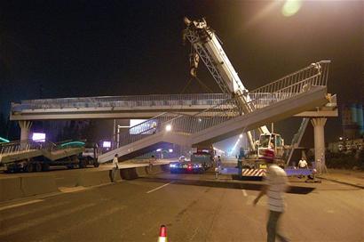 ????在將兩側(cè)輔橋拆除后,今日凌晨將拆除主橋。據(jù)了解,主橋長約35米,寬約3.5米,總重量達(dá)75噸左右。拆除時將使用兩臺噸位為150噸的大吊車,分別吊起主橋的兩頭,然后通過操作員的操控,將主橋由橫向調(diào)整成縱向,安放在長約30米的大型拖車上。“橋的長度相當(dāng)于整條路的寬度,施工時將占用全部車道。施工過程因此比較復(fù)雜,這將給交通帶來一定影響。”王兆偉說。