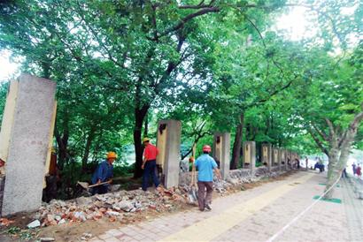 ????自8月4日中山公園小西湖門拆除以來,小西湖出入口至柞山路出入口的圍墻也被陸續被拆除。記者昨在園外看到,園內蔥蔥綠意“破”墻而出,與人行道上的樹木相呼應,初顯“透綠透景”的意境。走在園外人行道上的市民都不由自主地拿出相機,拍下園內美景。