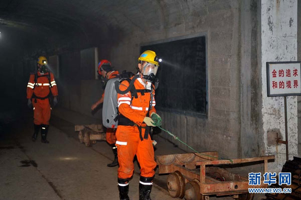 ??8月7日,在山東招遠(yuǎn)玲南礦業(yè)有限責(zé)任公司羅山金礦,救援人員在巷道口整理裝備。新華社記者 朱崢攝