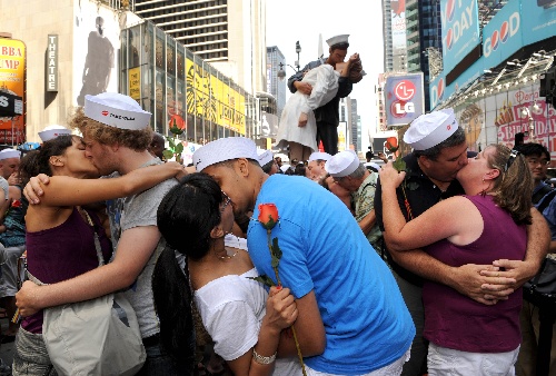 ????來自不同國家、不同種族、持有不同宗教信仰的200多對情侶,從上午10時起陸續會集在紐約時報廣場。男士戴著主辦方提供的白色水手帽,女士手拿一支玫瑰,盡情擁吻,以他們自己的方式紀念二戰勝利65周年,也表達他們對和平的向往。