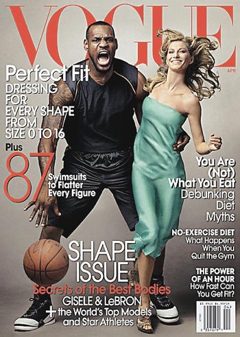 ????NBA球星勒布朗·詹姆斯與巴西超模吉賽爾·邦辰一起出現在2008年4月的《Vogue》雜志封面。隨著這期雜志的發行,讀者紛紛表示,這張身高206厘米,體重118公斤的黑巨人攬抱苗條的白人美女名模纖腰的封面照讓人聯想到電影《金剛》。美聯社也描述說,詹姆斯彎曲站立,張大嘴巴露出整個牙齒的造型酷似大猩猩。《時尚》方面當初以“黑人首次登上雜志封面”來宣傳4月號雜志封面的意義,但當事態擴散之后解釋說:“只是為了祝賀在各自領域登上最高位置的兩位超級明星而讓他們上了雜志封面。”