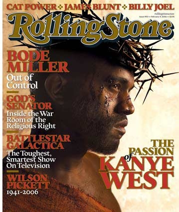 ????黑人說唱歌手肯尼·威斯特出現在《滾石》雜志的封面上,還裝扮成耶穌的樣子,封面遭到了許多保守人士還有基督教的抗議。