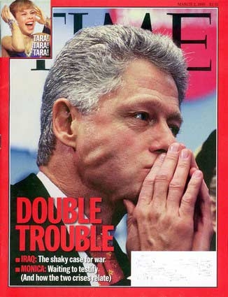 ????比爾·克林頓能被《時代周刊》雜志評選為“年度人物”自然是幸事。不過比爾·克林頓出現在1998年3月份的雜志封面上,頭上卻多了兩個“獸角”(字母M),不禁讓人產生聯想。