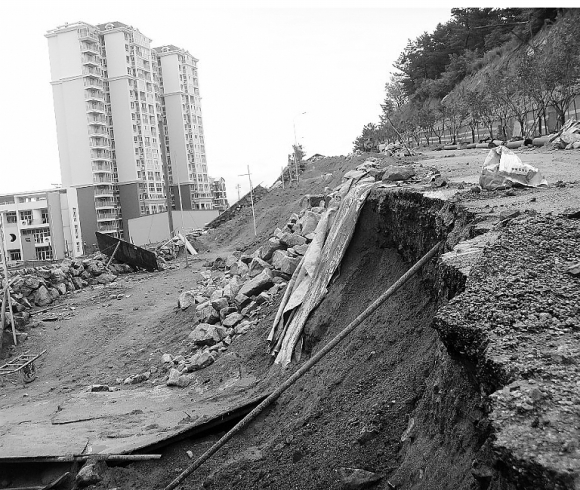 ????“6月份塌方道路的下面的泥沙基本被雨水掏空了,山上也有許多沙土被積水沖下來,如果出現山體滑坡,下面就是僅靠塌方處的居民樓呀。”25日,市北區公務員宿舍“枕海山莊”的居民趙女士告訴記者,6月2日晚他們小區道路邊約15米高的靠山墻突然坍塌,半山腰上路基塌方,大量土石順著山坡滾到枕海山莊小區內,幸好塌方并未造成人員傷亡。但將近3個月過去了,塌方路面至今仍未修復,而且這幾天大雨讓滑坡段和附近山體再次出現沙石下落的情況。