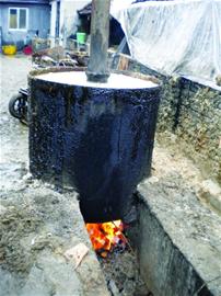 ????看到煙囪里冒著煙,記者繞到了房屋后面的露天加工間,發現兩名工人正在忙碌著。 8個原料池里裝著油脂類漂浮物,工人說是“雞下貨”。記者在現場看到,三個熬油用的大鐵鍋里裝滿了泔水,經高溫加熱后,工人撈出了漂浮物,繼續提煉剩余的初級油脂,而一名工人竟把塑料袋也扔進火里焚燒。記者撈起一勺正在加熱的油脂,一股惡臭襲來。屋內的加工間里,有幾個過濾原料的池子,堆放了多袋動物下貨原料。 “你們的地溝油從哪進的? ”記者問。 “油是從飯店買的,也有自己弄的。”工人說。“你們加工完再送回飯店,還是有車來拉貨?”記者問。“這個老板說了算,老板現在不在。 ”一名工人思考后回答。