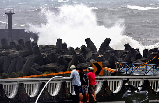 ????9月19日,臺灣宜蘭,當?shù)鼐用裨诤_呌^看拍岸大浪。超強臺風“凡亞比”減弱為強臺風,于19日9時在臺灣花蓮縣豐濱鄉(xiāng)附近沿海登陸,登陸時中心附近最大風力有15級。