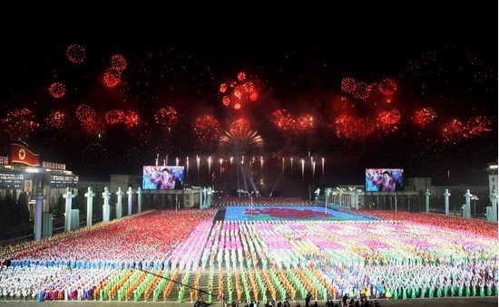 10日晚,朝鮮首都平壤,霓虹燈將大街裝飾一新,著名景點(diǎn)的周身被探照燈照亮;金日成廣場,焰火繁花似錦,群眾方陣用道具模擬出各種圖案和造型。朝鮮勞動黨建黨65周年慶祝活動在這里舉行,今晚的平壤變成名副其實(shí)的不夜城。