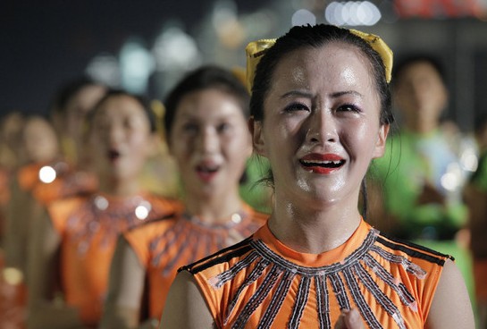 ????廣場對面的主體思想塔上,紅色的火炬被燈光點亮,似在夜空中熊熊燃燒,綠色的激光光束在人群組成的圖案造型背景變換時制造出炫目的視覺效果。