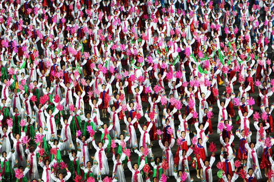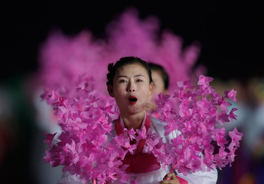 ????廣場兩邊豎起的大型電子屏幕用視頻生動具體地展示了這些成就。廣場中央,身著鮮艷傳統服裝的朝鮮群眾用手中的花束、彩帶等道具,組成各式各樣的圖案和造型,配合著電子屏幕中的影像變換著場景。