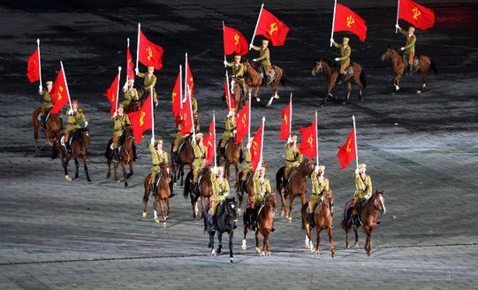 ????當兩隊騎兵舉著黨旗穿過人群走向主席臺,當主體思想塔上打出“勞動黨是勝利的組織者和向導者”的標語時,這場隆重的聯歡晚會成功落幕。