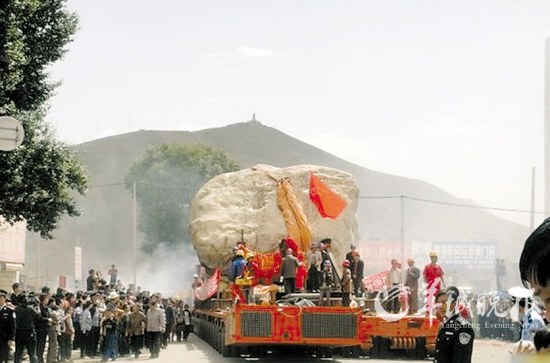 ????網帖說,有人在甘州石前面高擎紅旗,甘州石四面掛上標語。一路上,由警車鳴笛開道,浩浩蕩蕩向古浪縣城蠕動,縣城里人山人海,不少人放鞭炮、燒紙錢迎接。4個小時后,碩大的甘州石被安放在了古浪縣城北一個叫金三角的廣場,美其名曰“城標”。