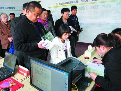 ????填寫選房草單、填寫選房確認(rèn)單、簽訂房屋安置定位協(xié)議……大約半小時(shí),拆遷居民就可辦理完畢拆遷安置手續(xù)。“很滿意,很好,過去我們一家四口人住在不到40平方米的小房子里,現(xiàn)在可好了,我選了一套100多平方米的新房,總算舒服了。”拿到三號(hào)選房權(quán)的王老太告訴記者,她和子女特意去新房周邊看了環(huán)境,房子采光好,又緊鄰超市,出門買個(gè)東西也方便,選到這處房子特別開心。(于順 張敏)
