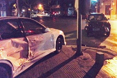 ????三菱轎車司機驚魂未定站在車旁跟朋友商量著。“我當時看到前面是黃燈,還以為要轉成綠燈,這才開過去,誰想到這輛越野車從側面沖出,撞在我的車身右側。”三菱轎車轉90度,來了個特技漂移,沖上了路邊的人行道,還把垃圾箱給刮倒了。而越野車司機姜先生稱,他本來打算送車上兩名女士回家,當時路口是綠燈,沒想到這輛三菱轎車突然沖出,他剎車不及撞了上去。交警部門正在調查此事。 (黃飛 于滈 徐棟 攝影報道)