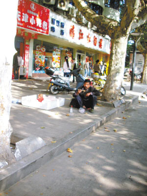 ??? 指使一歲小孩臥地討錢,父親則在一邊喝酒吃肉,全然不顧孩子,大東門的這副雷人的討錢景象讓過往路人無不氣憤。