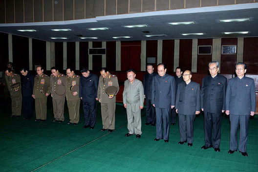 朝鮮中央通訊社11月9日提供的照片顯示,朝鮮最高領導人金正日(前右五)等黨政軍領導人吊唁朝鮮勞動黨中央政治局常委、朝鮮國防委員會第一副委員長趙明錄次帥。連日來,朝鮮黨政軍領導人、人民軍官兵和民眾前往安放趙明錄遺體的勞動黨會館吊唁。朝鮮勞動黨中央政治局常委、國防委員會第一副委員長、人民軍次帥趙明錄因長期患心臟病,于當?shù)貢r間6日10時30分去世,享年82歲。