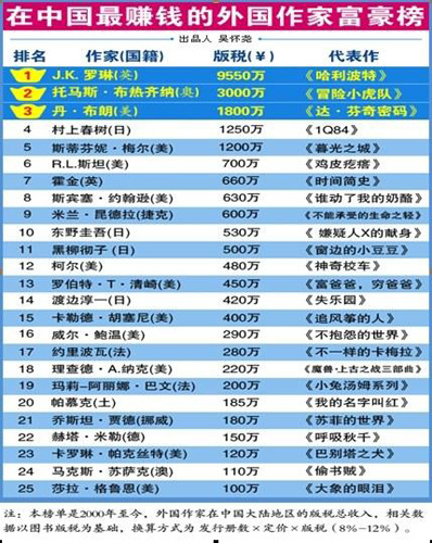 ????這一次,與中國作家富豪榜同時發(fā)布的還有21世紀(jì)第一個10年在中國最賺錢的外國作家富豪榜,這個榜單的榜首位置并無懸念,寫出《哈利·波特》系列的英國作家J.K。羅琳十年來在中國內(nèi)地拿到9550萬元的版稅成為第一;排名第二的是奧地利作家布熱齊納,他的代表作品是《冒險小虎隊(duì)》,他在中國獲得了3000萬元的版稅;排名第三的美國作家丹·布朗對大家而言也不陌生,《達(dá)·芬奇密碼》在中國已經(jīng)引發(fā)了“密碼”熱。