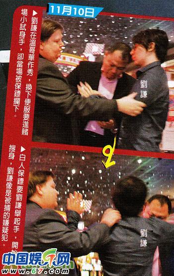 ????《劉謙變萬化之世界巡回演出》11月10日赴溫哥華列治文河石劇場(River Rock theatre)舉行兩場巡演,演出后他換上便服,欲到賭場小試手氣,卻被賭場保鏢怕他出老千強行搜身,逼劉謙卷起長袖才放行,一臉無奈的模樣被其他賭客拍個正著。