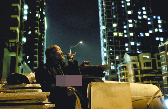22日晚,想家的曹大爺倚在"家"門口的建筑材料上,身后是高層小區的點點燈火