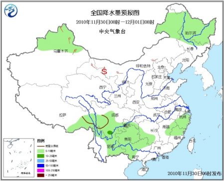 ????30日08時(shí)至12月1日08時(shí),新疆北部、西藏東部、川西高原中部、內(nèi)蒙古東北部、黑龍江大部、吉林北部等地有小到中雪(雨)或雨夾雪,其中,新疆北部的部分地區(qū)有大雪,局地暴雪;四川南部、云南北部和中東部、貴州、重慶南部、湖南西部、廣西北部和西部、江西東北部、浙江大部、福建北部等地有小到中雨或陣雨。新疆北部、甘肅西部、內(nèi)蒙古中西部等地有4~6級(jí)風(fēng),新疆山口地區(qū)風(fēng)力可達(dá)8~9級(jí);內(nèi)蒙古西部的部分地區(qū)有揚(yáng)沙或浮塵天氣。東海南部海域?qū)⒂?~7級(jí)東到東北風(fēng);臺(tái)灣海峽、臺(tái)灣以南海域、南海北部和中部海域?qū)⒂?~7級(jí)東北風(fēng)。