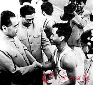 1959年,周恩來(lái)、賀龍?jiān)诘谝粚萌\(yùn)會(huì)上為陳鏡開(kāi)頒獎(jiǎng)?wù)隆?/p>
