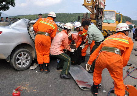 記者從西雙版納傣族自治州消防支隊了解到:接到救援指令后,景洪大隊迅速出動1輛搶險救援車和7名官兵趕赴現場實施救援。10時30分抵達現場時,發現公路上到處都是撞擊后的散落物,轎車車頭嚴重變形,轎車內還有3名有生命跡象的傷員被死死卡住,而且滿臉血跡,表情萬分痛苦。消防官兵立刻利用液壓破拆器材,熟練地對比亞迪轎車左右車門進行破拆,擴大救援空間,同時隨時保持與被困人員聯系,并準備液壓擴張器材,對牽引后的車輛進行破拆。