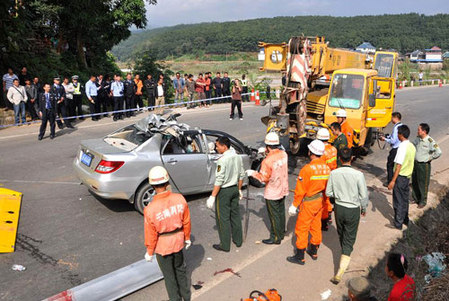 上午9時42分,景洪市景(景洪)大(大勐龍)二級公路18公里曼達糾村附近,一輛快速超車的比亞迪轎車撞上行駛中的一輛大吊車,導致車上的6名駕乘人員3死3傷。
