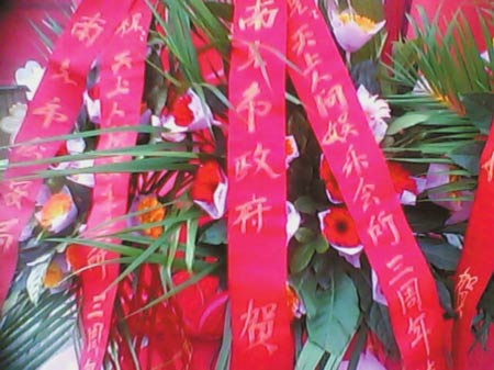 南充“天上人間”國際娛樂會所3周年慶典活動現(xiàn)場,大門口擺滿了祝賀花籃,其中兩個花籃扯人眼球,祝賀單位是“南充市政府”和“南充市公安局”。