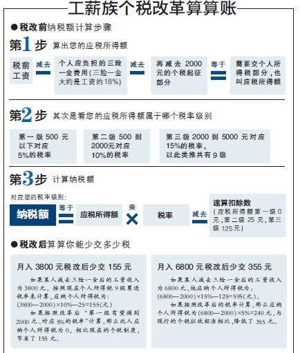 ????如果按照改革后“第一級有望調到2000元、對應5%的稅率”計算,那么此人應納個人所得稅為0,相比現在的個稅制度,節省了155元。