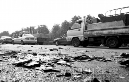 雖然只有了兩條車道能夠通行,但此時一旁的過路汽車還要注意地面上遍布的各種汽車碎片。