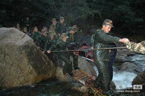 ????2010年12月13日凌晨2點37分,在安徽黃山景區(qū)因迷路被困的18名上海驢友在黃山景區(qū)一個未開發(fā)開放區(qū)域被當(dāng)?shù)厮丫热藛T找到,不幸的是,50分鐘后,23歲的黃山風(fēng)景區(qū)公安局民警張寧海在護(hù)送途中不幸墜崖身亡。圖為武警官兵護(hù)送張寧海的遺體。
