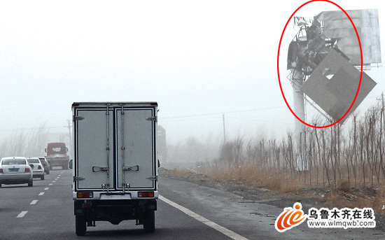????過了收費站一百多米的地方,一座巨型廣告牌中間斷裂,搖搖晃晃地掛在支柱上,隨時都有掉下來的可能。一些被刮下的鐵皮有的纏在路旁的樹上,有的懸掛在電線上。