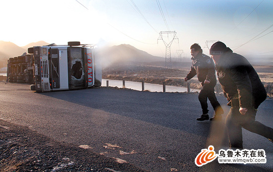 17時43分,在東過境公路,天山區交警大隊民警吐爾遜·阿吉(左)與哈薩克斯坦司機優拉在大風中艱難行走。當日早上8時許,優拉駕駛的一輛貨車被大風吹翻在路邊。