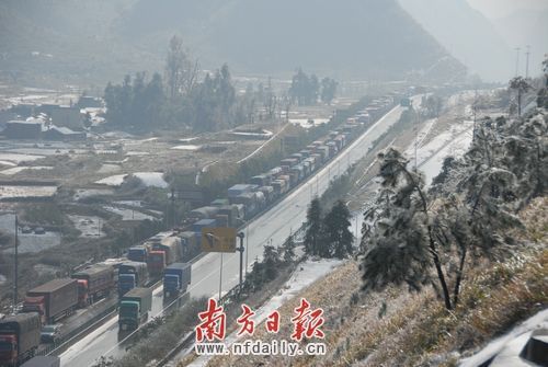 梅花到大橋約四十多公里路段無(wú)法通車(chē),北上南下都出現(xiàn)不同程度的堵塞。而與京港澳高速公路并行的韶關(guān)坪乳公路同樣出現(xiàn)冰凍,車(chē)輛也無(wú)法通行。