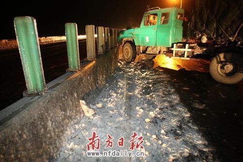 京珠北路面結(jié)冰,一輛貨車(chē)打滑碰撞致道路堵塞(南方日?qǐng)?bào)記者 盧慧明 攝)