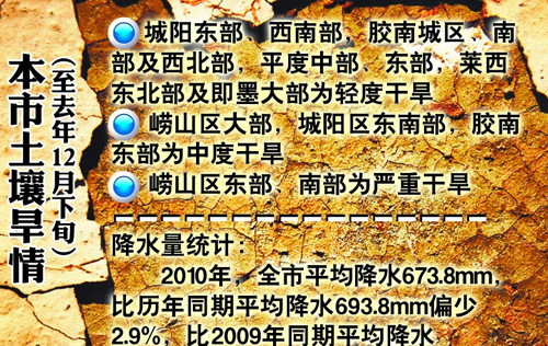 ????4日市水文局發布了2010年降水、蓄水、旱情的總體情況。“10月份以來,全市降水量異常偏少,出現了歷史罕見的旱情。”工作人員告訴記者。2010年10月1日至12月31日,全市平均降水僅 9.1mm ,比歷年同期偏少86.9% ,黃島、城陽、即墨、膠州、膠南都偏少90%以上,是有水文資料記載以來第2少的年份,僅高于 1969年的5.7mm 。到目前為止,全市平均已有89天無有效降雨,黃島、城陽、即墨、膠州、膠南連續無有效降雨天數已超過100天。